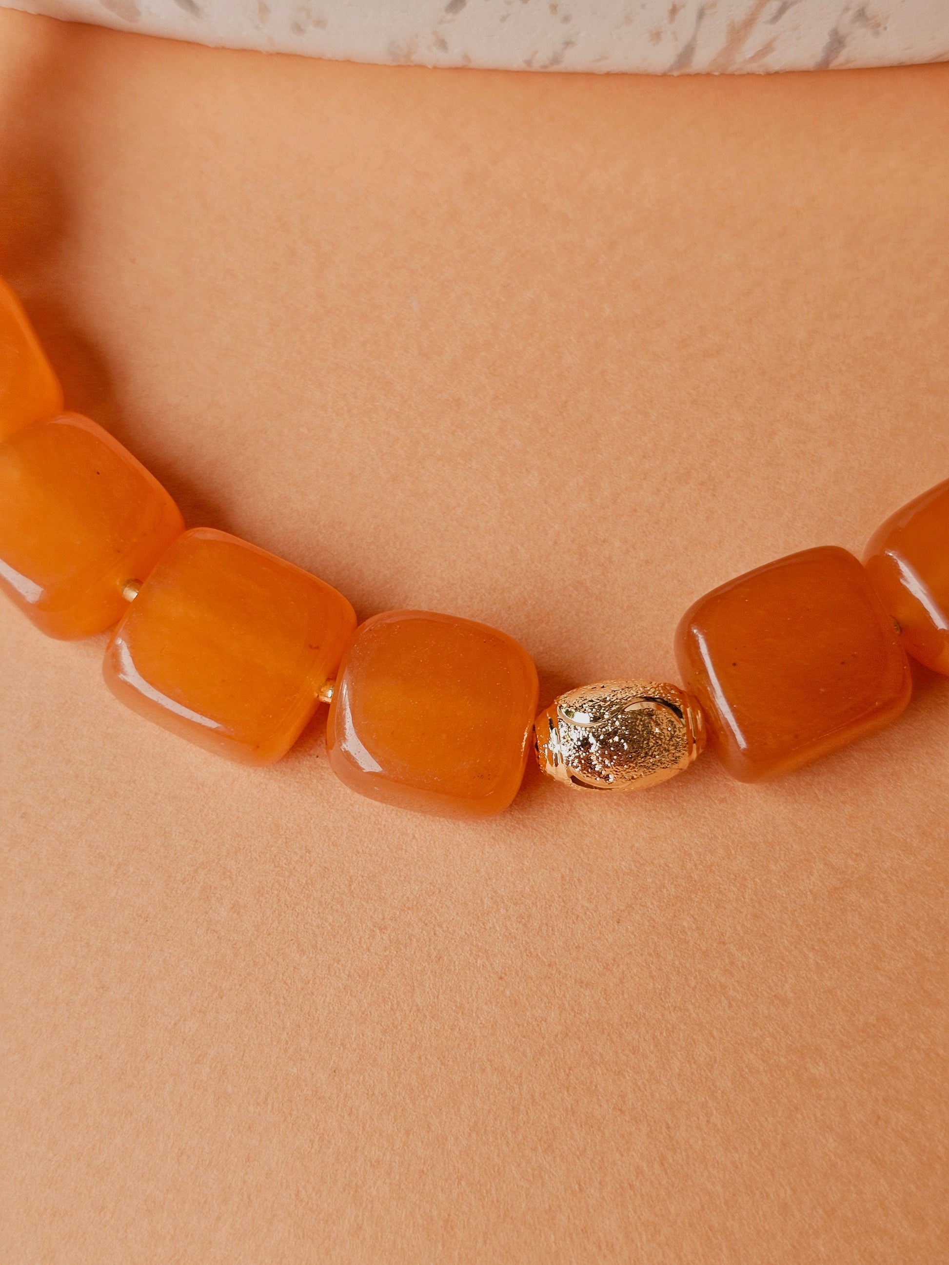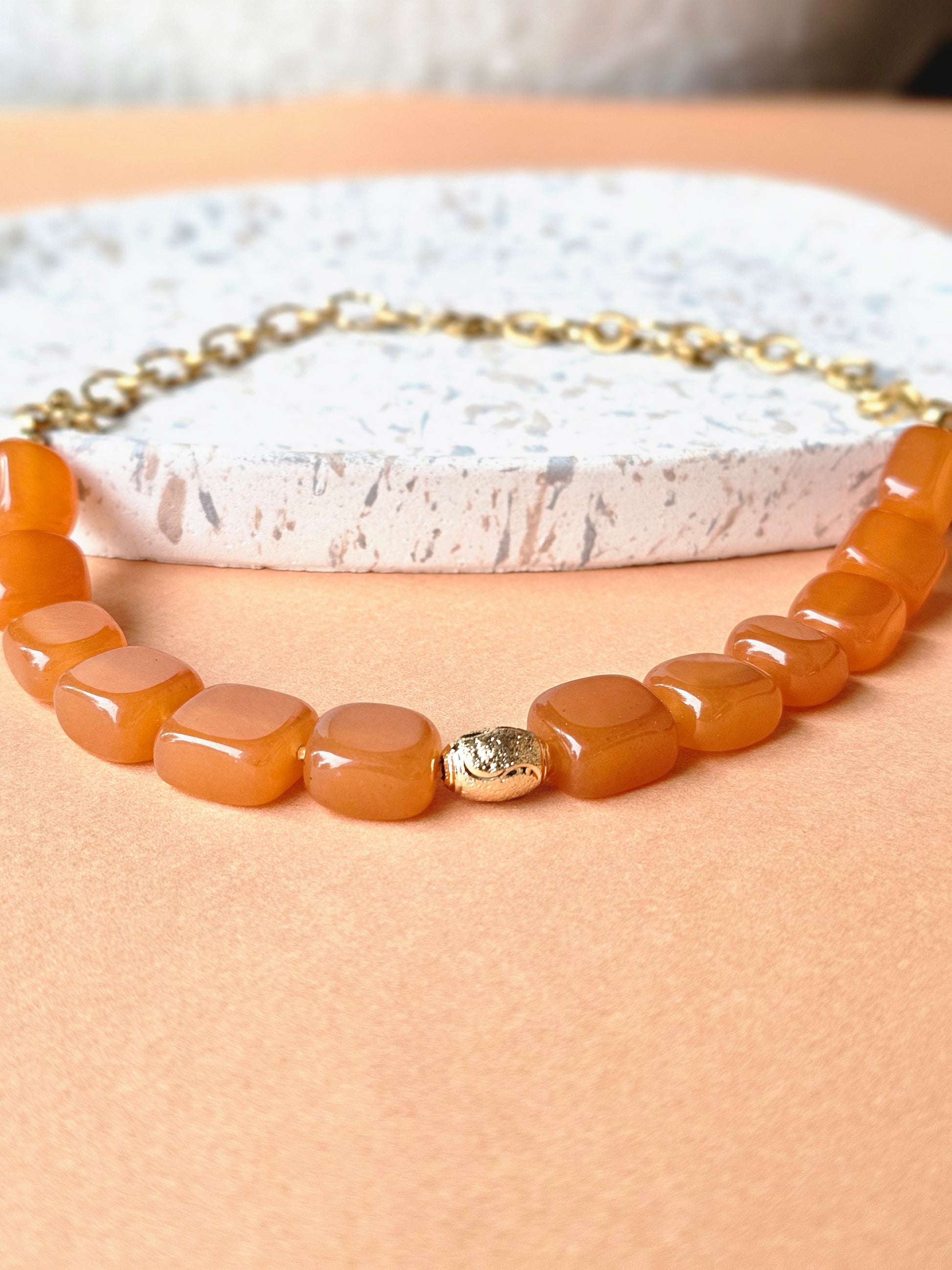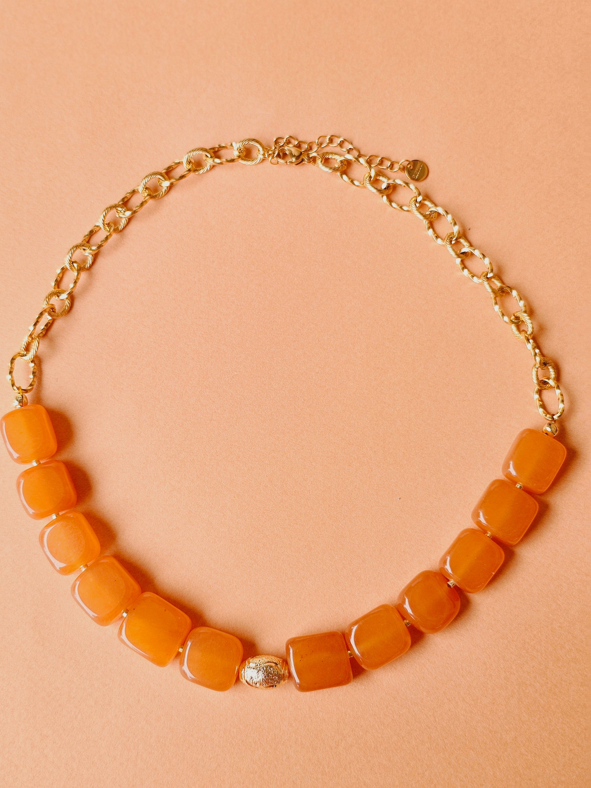 Un joli chaînon doré en acier inoxydable, des perles orangées qui réveillent ton look et une petite boule dorée pour la touche chic. MADISON, c’est le collier qui te donne du caractère sans en faire trop : simple, frais et prêt à tout matcher.